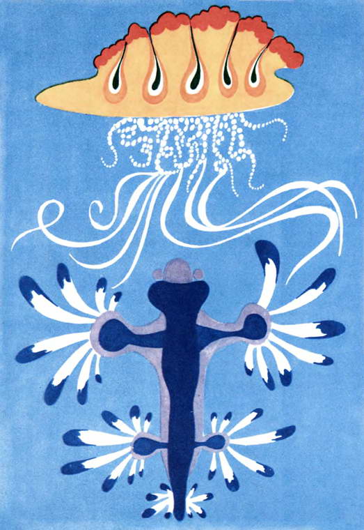 Самый яркий и чистый синий цвет имеет поверхность открытого океана в тропической зоне. Там все только белое и синее. Ярко-голубое небо с белыми облаками отражается в глубокой синеве морской воды. В ветреную погоду гребни синих волн белеют яркими барашками. Когда с борта судна смотришь на воду, она кажется совершенно безжизненной, только стайки серебряных летучих рыб разлетаются в стороны на синих крыльях-плавниках, да изредка заметишь покачивающуюся на волне большую морскую черепаху. Но вот за борт опущен плейстонный трал — рама с поплавками, на которую натянута мелкоячеистая сеть. Прибор тянется за судном и собирает с поверхности невидимых для глаза животных. Они незаметны вовсе не из-за микроскопических размеров, а потому, что замаскированы под цвет морской воды. Через несколько минут траления сеть наполняется синими, голубыми и белыми обитателями тропического океана.