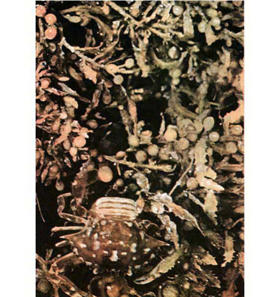 Среди водорослей в поисках пищи пробираются маленькие крабы наутилограпсусы, которые так же, как саргассовые креветки, имеют бурую окраску.