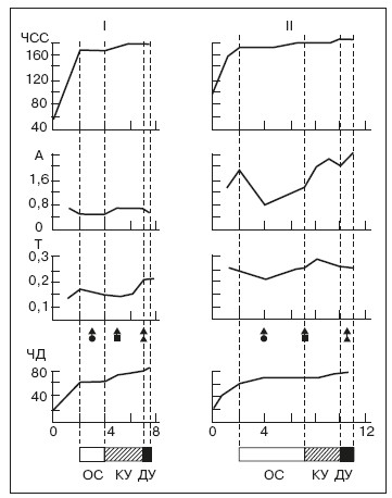 По оси ординат: частота сердечных сокращении (ЧСС), уд./мин; амплитуда (А) ЭМГ икроножной мышцы. мВ: длительность активности (Т) в ЭМГ икроножной мышцы, с; отчет испытуемого о самочувствии: стрелка с кружком – «Хорошо!», с квадратом – «Устал!», с треугольником – «Очень устал!»; частота дыхания (ЧД), 1/мин; стадии работоспособности: