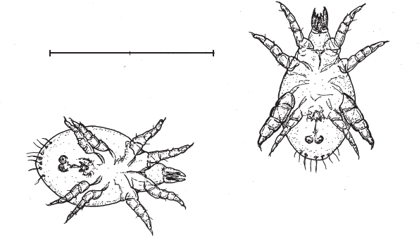 рис. 15.1. Корневой клещ Rhizoglyphus robini. Показаны две формы самцов: обычный миролюбивый (слева) и «боец» (справа), использующий мощную третью пару ног для смертельных схваток с конкурентами за благосклонность самок. Этот признак — результат полового отбора, однако он, в отличие от других инструментов конкуренции, влияет лишь на самцов и безразличен для самок и в краткосрочной перспективе эксперимента неподвластен родственному отбору. Длина масштабной линейки — 1 мм.