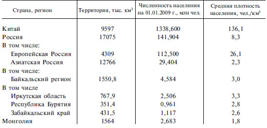 Заселенность российских, китайских и монгольских территорий очень неравномерная, что видно по данным о распределении населения по приграничным регионам (табл. 13.2, табл. 13.3).