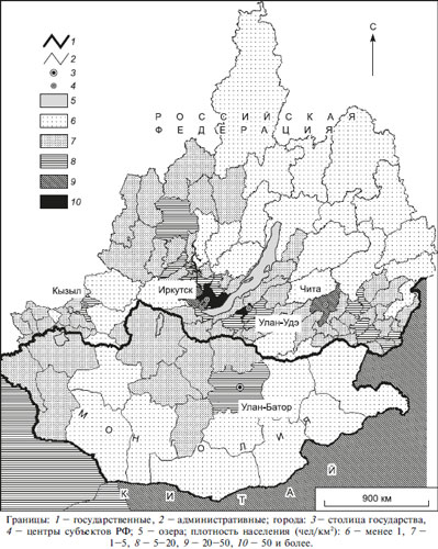 Плотность населения различается более чем в 10 раз, при этом еще более контрастны различия между китайским Хэйлунцзяном и соседними дальневосточными регионами России. Значительны различия и внутри этих стран. Так, в Байкальском регионе северные таежные и горные территории имеют крайне редкое, дисперсно расселенное население. Концентрация населения отмечается только в лесостепной и южно-таежной зонах, где размещаются главные индустриальные центры, проходят транспортные коммуникации, располагаются основные сельскохозяйственные районы (рис. 13.1). Зоны повышенной заселенности Южной Сибири и Центральной Монголии фактически смыкаются на южной границе Бурятии.
