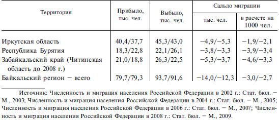 Перераспределение населения внутри Байкальского региона происходит весьма интенсивно, охватывая несколько тысяч человек ежегодно. При этом Иркутская область выбирает население из Забайкалья, на каждых двоих выбывших в Бурятию и Забайкальский край приходятся трое прибывших. Миграционный обмен с Забайкальем дает Предбайкалью около 2–3 тыс. чел. миграционного прироста ежегодно. На Забайкалье приходится 27 % в прибывшем контингенте из-за пределов Иркутской области и 14 % среди выбывших за ее пределы. При доле Забайкалья в населении России – 1,5 %, относительная интенсивность миграционных связей на порядок превышает среднюю интенсивность всех других миграционных связей.