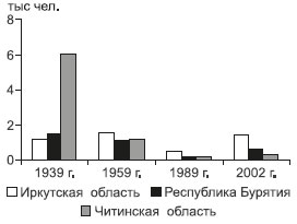 Российские статистические данные о миграции в основном приспособлены к отражению внутрироссийского переселенческого движения. Данные о трансграничной миграции, иностранной рабочей силе, численности иностранных граждан и нелегальной миграции чрезвычайно неполны и зачастую противоречивы. Так, на примере китайцев видно, как переписи населения показывают неуклонное снижение численности национальных групп иностранного происхождения до 1989 г., а затем весьма незначительное приращение их численности (рис. 13.2). Если данные 1939 г. вполне естественно фиксировали рост численности китайцев от Иркутской области к Читинской (с запада на восток), то данные 2002 г. нелогично показывают обратную тенденцию, хотя китайской рабочей силы значительно больше в Читинской области (см. рис. 13.3 и рис. 13.4). Последняя перепись охватывала только постоянное население (прожившее в данном месте один год и более), но, не охватывая временно пребывающих на территории лиц, не давала современной расселенческой и миграционной картины, касающейся как всего населения, так и отдельных этнических групп. Пограничная статистика показывает, что на постоянное место жительства в Россию приезжают единицы, а выезжают и сотни человек (см. табл. 13.6).