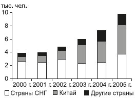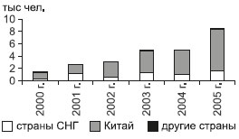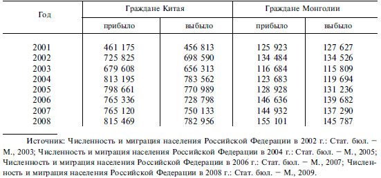 Если за 1998–2001 гг. в России остались в общей сложности 35,9 тыс. китайцев, то в 2002 г. – 27,2, в 2005 г. – 25,7, в 2008 г. – 32,5 тыс. китайцев, что вдвое выше среднегодового уровня предшествующих лет. Граждане Китая совершают поездок в Россию и обратно в 5–6 раз больше, чем граждане Монголии. Однако относительное значение России для китайцев и монголов совершенно разное. Так, если на 1000 среднестатистических китайцев приходится 0,6 поездок в Россию (800 тыс.: 1300 млн = 0,6), то на 1000 монголов – 43,0. Иначе говоря, ежегодно одна поездка приходится на 1700 жителей Китая и на 20 жителей Монголии.