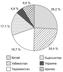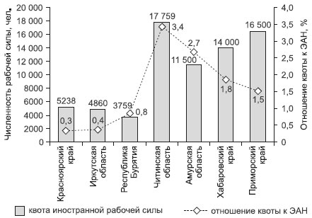 Действующий механизм привлечения иностранной рабочей силы через квотирование позволяет оценить относительную потребность регионов в рабочей силе (рис. 13.7). Выявляется своеобразный забайкальский «перелом» потребности в иностранной рабочей силе, пролегающий между Читинской областью и Республикой Бурятией. Помимо количественного перелома имеется и структурный перелом, выражающийся в том, что для Забайкалья роль рабочей силы из стран СНГ совершенно ничтожна, но сильно влияние Китая.