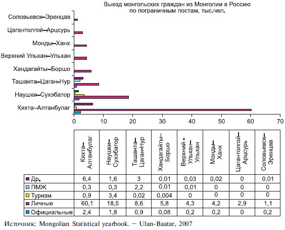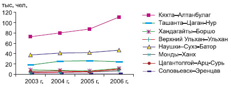– через прочие КПП следуют меньшие потоки: от 1,5 тыс. (Соловьевск-Эренцав) до 11,5 тыс. чел. (Хандагайты-Боршо).