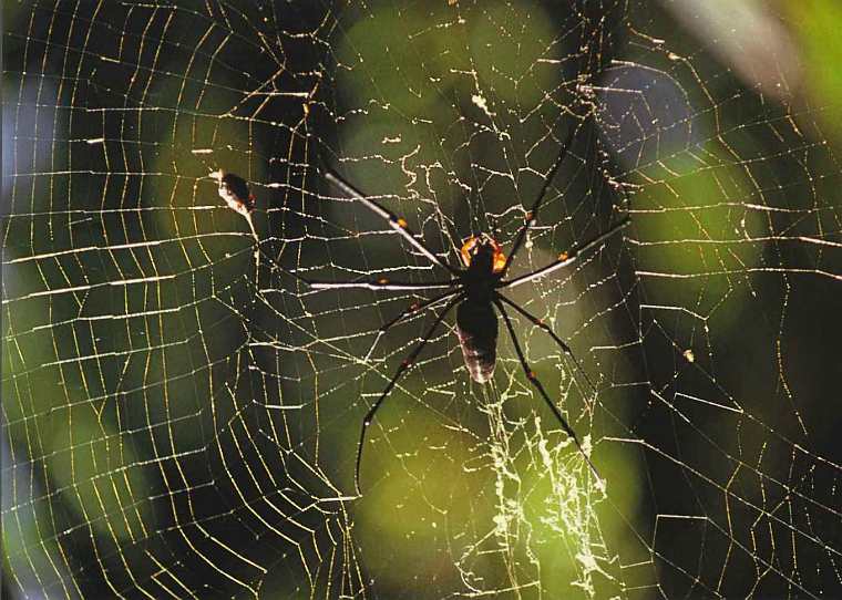 Этот паук-нефила выглядит довольно устало, починяя свою ловчую сеть, и поэтому можно догадаться, что в нее уже успело угодить очень много насекомых. Но несмотря на усталость, этот паук будет продолжать с максимальной тщательностью залатывать все дыры.