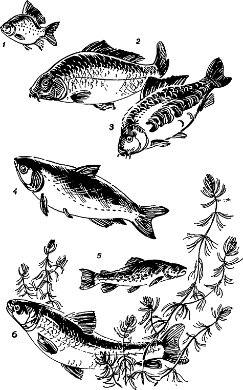 1 — карась; 2 — сазан; 3 — карп; 4 — толстолобик; 5 — форель; 6 — белый амур.