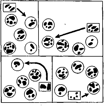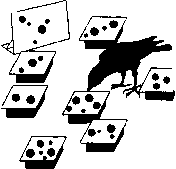 Перед коробочками клали маленькую табличку — своеобразный ключ для отыскивания птицей коробочки с пищей. В начале опытов на этой табличке было нанесено только два пятна, затем число их увеличивали, но не более чем до 5, причем пятна на табличке по величине, форме и группировке отличались от нанесенных на крышках коробочек. Следовательно, птица имела возможность уловить только количественную связь между пятнами на табличке-ключе и пятнами на крышках коробочек. Экспериментаторы добились, наконец, того, что ворона по имени Якоб безошибочно подходила к той самой коробочке, в которой была спрятана пища. О чем свидетельствует этот успех? О том, что птицы, по крайней мере некоторые из них, способны уловить общность, которая существует в двух группах, состоящих из нескольких (в пределах пяти) элементов, несмотря на их различие по форме, величине и взаимному расположению. Эта общность может быть только количественной.