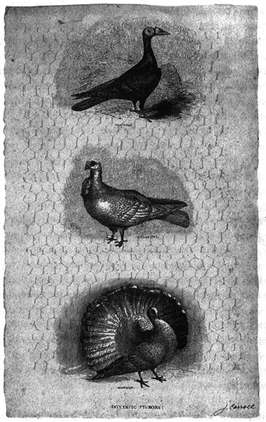 Голуби Дарвина. На примере большого разнообразия декоративных голубей, произошедших от сизарей, Дарвин иллюстрировал силу естественного отбора различных вариантов. Иллюстрации из сборника The Variations of Animals and Plants under Domestication, vol. 1, London: John Murray, 1868; монтаж Джейми Кэрролл.