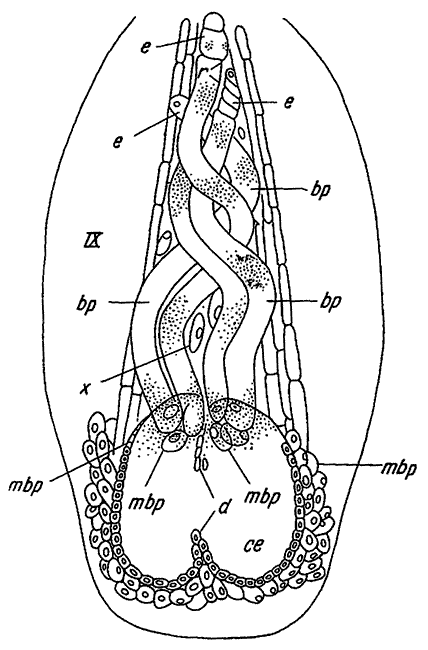 Согласно Гофмейстеру, три клетки, расположенные на другом, противоположном пыльцевходу, нижнем конце зародышевого мешка — антиподы, принимают участие в переработке питательных веществ для развивающегося зародыша. Эту точку зрения немецкого ученого развивают и некоторые из современных эмбриологов (Поддубная-Арнольди, 1964).