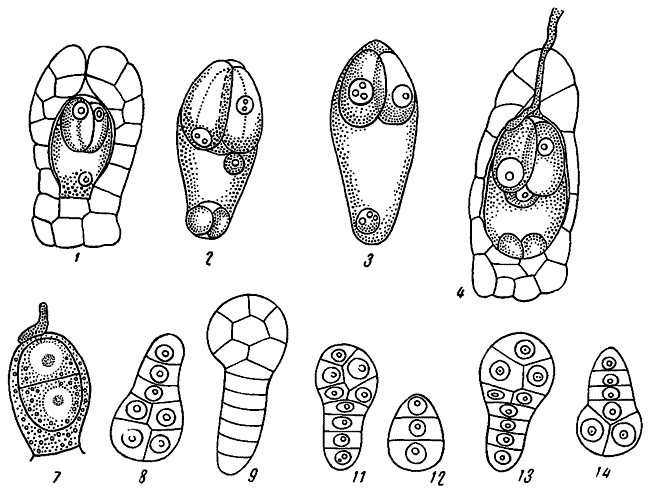 Зародышевый мешок и первые стадии развития зародыша у Orchis и Cymnadenia по Гофмейстеру. 1849.
