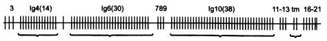 Строение гена DSCAM малярийного комара. Вертикальными отрезками показаны экзоны. Иммуноглобулиновые экзоны 4, 6 и 10 представлены кассетами из 14, 30 и 38 альтернативных вариантов. Зрелая РНК после сплайсинга будет содержать лишь по одному варианту каждого из этих трех экзонов.