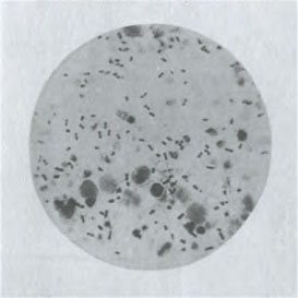 Рис. 7. Мазок из мокроты больного легочной чумой. Четко выражена биполярная окраска клеток Y. pestis [Wu Lien-Teh at al., 1936].