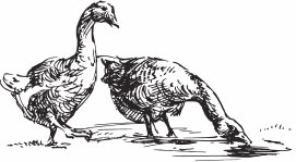 При подвеске гусей надо заложить крылья одно за другое, что поможет предотвратить их резкие движения при забое, после убоя снова расправить крылья. Внизу подставить посуду для сбора крови, вытекающей из тушек после забоя. Ее можно употребить на корм птицам и животным, проварив в течение 30 мин.