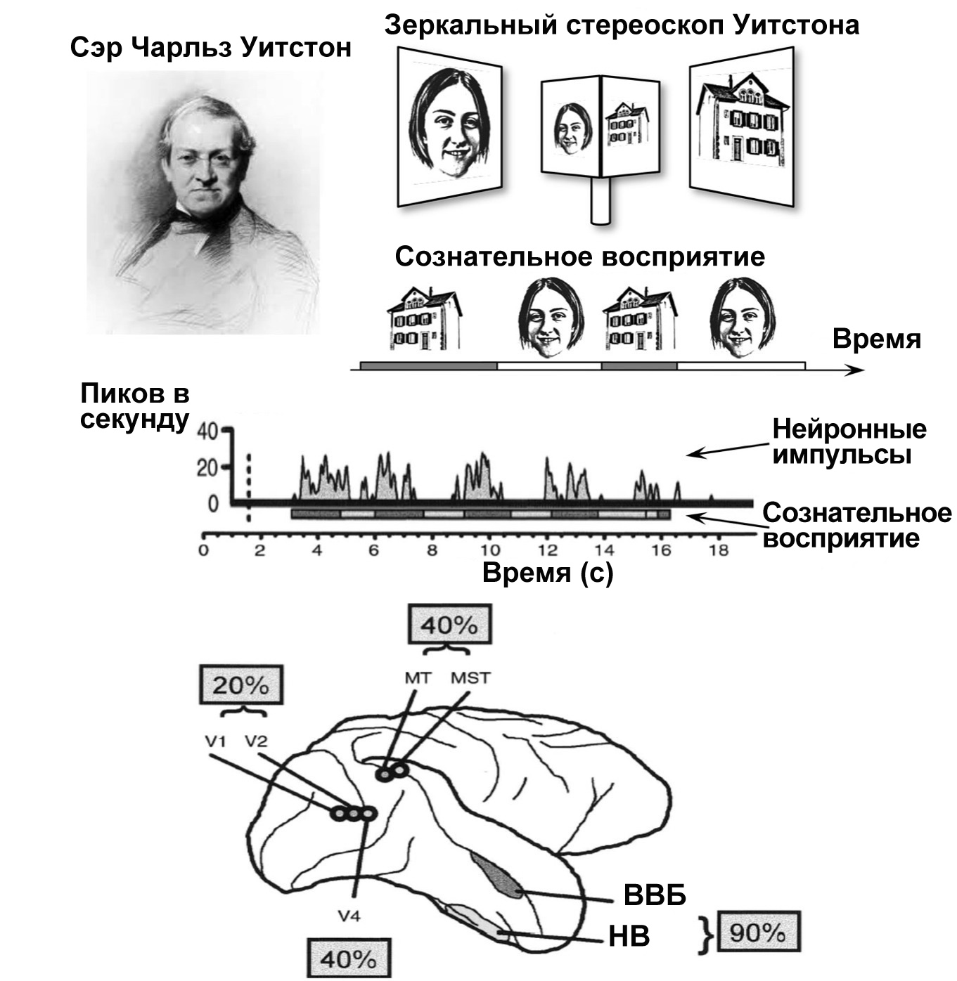 Рисунок 4. Бинокулярное соперничество — интереснейшая оптическая иллюзия, открытая Чарльзом Уитстоном в 1838 году. Каждый глаз видит свою картинку, но сами мы в любое отдельное мгновение видим только одно изображение. Здесь перед левым глазом расположено изображение лица, а перед правым — изображение дома. Однако вместо того, чтобы видеть накладывающиеся друг на друга образы, мы воспринимаем изображения поочередно: то лицо, то дом, то опять лицо и так далее. Экспериментируя с обезьянами, Никос Логотетис и Дэвид Леопольд научили своих подопытных с помощью джойстика сообщать о том, что они видят, ученые продемонстрировали, что обезьяны также подвержены воздействию этой иллюзии, и зафиксировали характер возбуждения нейронов в мозгу у животных. На ранних этапах обработки зрительного образа в областях V1 и V2 большая часть нейронов отображала оба образа одинаково успешно и иллюзия не возникала. Однако на более высоких уровнях, например в НВ-коре (нижневисочной коре) и в ВВБ (верхней височной борозде), деятельность преобладающего числа клеток коррелировала с субъективным осознанием: по силе посылаемого нейронами импульса можно было понять, какой образ в данный момент видит испытуемый. Цифры указывают, какова доля этих нейронов в различных отделах мозга. Результаты этого беспрецедентного исследования заставляют предположить, что сознательное восприятие опирается в основном на деятельность высоких уровней ассоциативной коры головного мозга