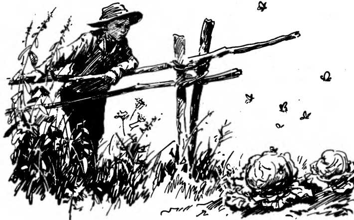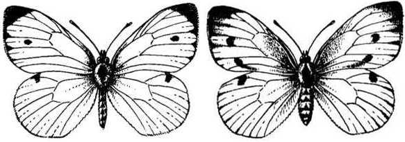 Присмотритесь к капустным грядкам: летают ли над ними капустницы? Крупная белая бабочка заметна издали, увидеть ее легко. Кто летает: самец или самка? Различить их нетрудно: у самки посредине передних крыльев есть черные пятна, у самца таких пятен нет (уголки передних крыльев черные и у самки и у самца). Пятна хорошо заметны и у летающей бабочки, конечно — вблизи.