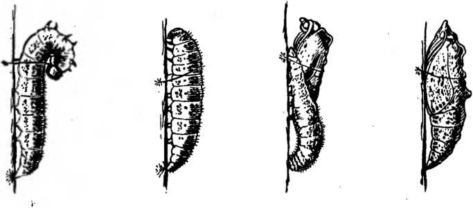 Найдя подходящее место, гусеница ткет шелковую подушечку: за нее позже крепко зацепится задний конец куколки. Затем она словно привязывает себя пояском из шелковинок, перекинутым через туловище.