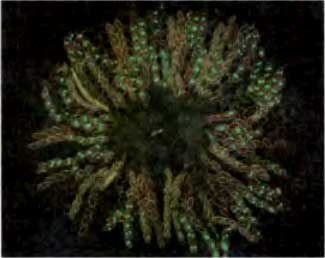 Флуорограмма розетки созревающих асков от гетерозиготного скрещивания трансформанта, сконструированного таким образом, что он экспрессирует гистон Н1, меченный (tagged) GFP Четыре аскоспоры в каждом аске обнаруживают светящиеся ядра (Freitag et al., 2004b) (фото любезно предоставлено N.B. Raju, Stanford University)