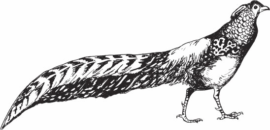 Окраска алмазного фазана (рис. 39) столь же ярка, как у его золотого собрата. Голова у самцов этого вида украшена черным хохолком с красными кончиками перьев. Серебристо-белые перья на затылке и «воротнике» самца украшены темной каймой. Остальная часть головы, шея, спина и бока – блестящего зеленого цвета, концы перьев украшены сине-черной каймой. Нижняя часть туловища у алмазного фазана – белая. Ярко-красные перья надхвостья удлиненны, а серебристо-белый хвост украшен поперечными красными полосками.