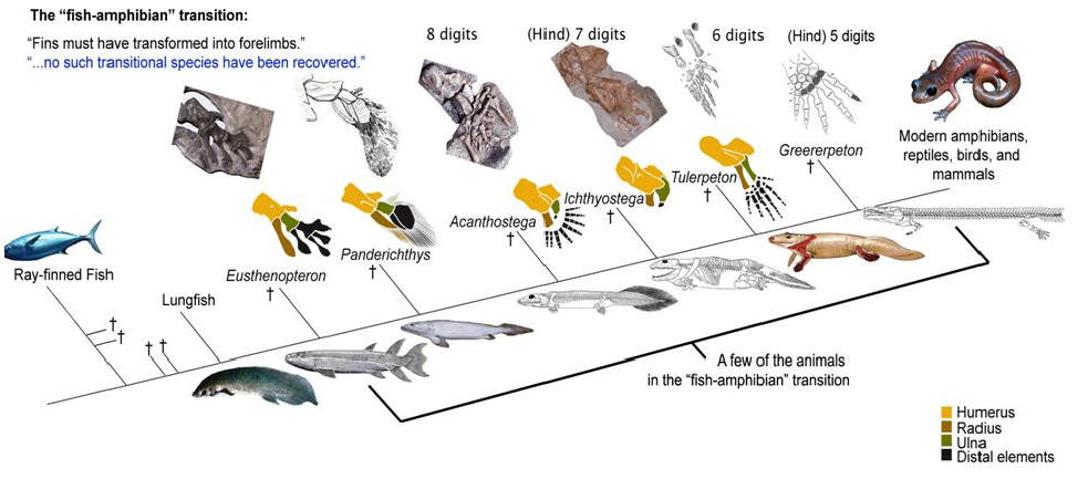 По сути дела, основное, что изменилось при переходе от рыб к тетраподам — это строение конечностей. Но конечности (плавники) девонских лопастеперых рыб не так уж сильно отличались по своему строению от лап примитивных тетрапод. А главное, можно в деталях проследить изменения конечностей в эволюционном ряду, соединяющем рыб и тетрапод. На сегодняшний день этот филогенетический ряд включает около дюжины последовательных переходных форм, из которых можно упомянуть наиболее важные (в порядке убывания рыбьих и накопления тетраподных черт строения): Eusthenopteron, Panderichthys, Tiktaalik, Elpistostege, Livoniana, Elginerpeton, Ventastega, Metaxygnathus, Acanthostega, Ichthyostega, Tulerpeton (жирным шрифтом выделены роды, у которых известно строение конечностей; у остальных конечности сохранились плохо или вовсе пока не найдены). Первый род в этом списке — еще «типичная рыба», последний — бесспорная амфибия. Посередине помещаются все промежуточные этапы этого «макроэволюционного» преобразования.