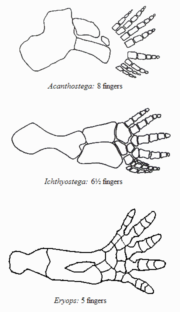 Конечности древнейших животных, которых безоговорочно относят уже к тетраподам, то есть к первым амфибиям (акатностега, ихтиостега), представляют собой всего лишь еще один небольшой шажок в сторону дифференциации дистальных частей скелета, т. е. кисти. У акантостеги еще сохранялись внутренние жабры, у ихтиостеги они уже редуцировались (наружные жабры у личинок амфибий сохраняются и сегодня). В дальнейшем у древнейших амфибий происходило постепенное развитие шейного отдела. Совершенно непонятно, где в этом ряду находится искомый великий «макропереход». Сказать, что переход от эустеноптерона к пандерихту и от пандерихта к тиктаалику — это «микро», а вот от тиктаалика к акантостеге — это уже «макро», может только очень предвзятый человек. И, конечно, среди специалистов-палеонтологов нет никого, кому пришло бы в голову это утверждать.