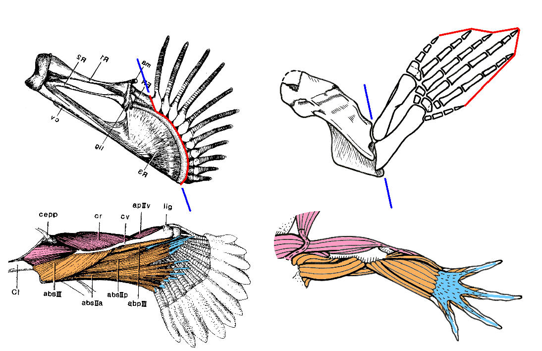 Схема строения передних конечностей мелководного удильщика Antennarius и древней амфибии Tulerpeton. Гомологичные группы мышц показаны одинаковыми цветами. Синей линией показано «главное место сгиба»: у тулерпетона это локтевой сустав, а у удильщика — нечто совсем другое, но аналогичное по функции. Изображение предоставил А.Н.Кузнецов.