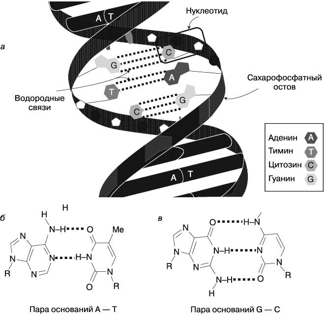Рис. 7.1. Структура ДНК: а — двойная спираль Уотсона и Крика; б — схема связи между спаренными основаниями A и T; в — схема связи между спаренными основаниями G и T. На схемах водородные связи (общий протон), объединяющие два основания в пару, показаны пунктирными линиями. В этом стандартном (каноническом) представлении сплетения оснований, предложенном Уотсоном и Криком, основания изображаются в их обычной, нетаутомерной форме