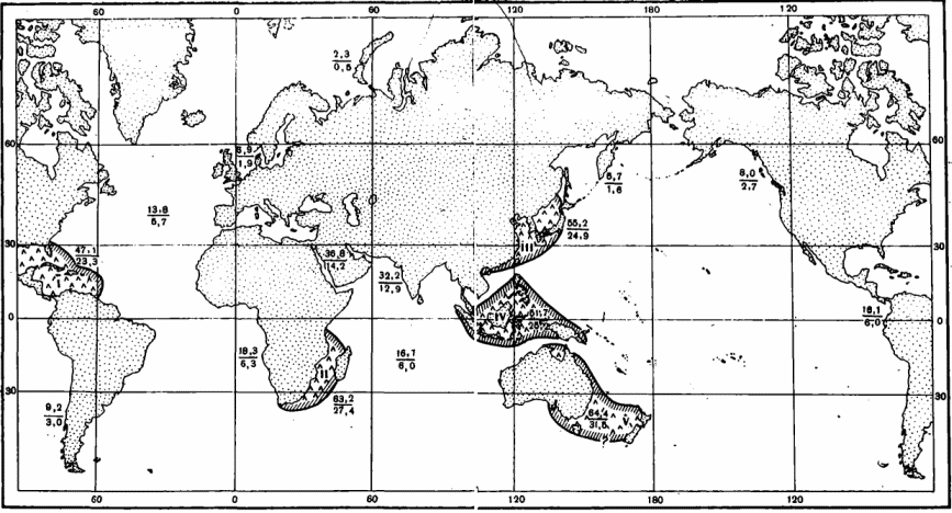 Рис. 10. Центры видового многообразия акул и число родов и видов акул в разных регионах (над чертой — число родов, под чертой — число видов, в % от общего числа)
