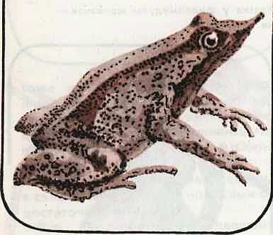 Но как ни оригинальна внешность рогатой жабы, ей далеко до носатой. Та, правда, не так ярко окрашена, но зато «фигура» у нее просто удивительная. Вообще-то осиной талией ни одна из жаб на свете не может похвастаться, но и яйцеобразной фигуры нет ни у кого, кроме носатой. Голова как бы вписана в овал яйца, и только часть ее вытянута и торчит отростком, наподобие большого носа. Ноги — пухлые, как вытянутые детские надувные шарики, а на этих ногах, да при такой фигуре, — кавалерийские шпоры! Но не для верховой езды нужны носатой жабе эти украшения на задних ногах, а для того, чтоб рыть землю — устраивать себе норы да добывать термитов, которыми она питается.