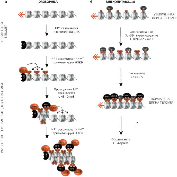 Рис. 14.4. У мух и млекопитающих функции теломер регулируются эпигенетически