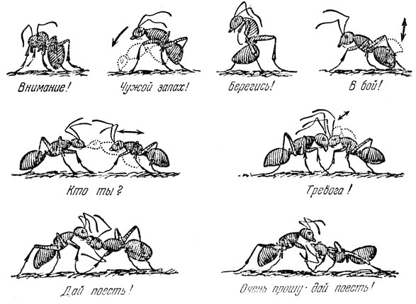 Весьма многообразны способы общения у насекомых. Так, например, энтомолог профессор П. И. Марковский, наблюдая в течение нескольких лет красногрудых древоточцев, отличающихся очень крупными размерами, установил, что сложные взаимоотношения членов муравьиной семьи сопровождаются своеобразными жестами (рис. 1). "Язык жестов этого вида, — пишет ученый, — оказался очень богатым. Мне удалось подметить более двух десятков сигналов...