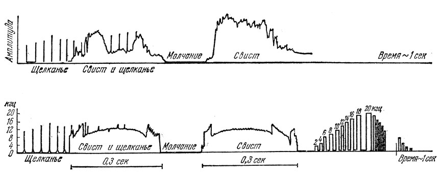 Разнохарактерные сигналы третьего класса названы по аналогии с сигналами других животных — лай, вой, мяуканье и т. д. Они представляют собой неультразвуковые щелчки и длятся от десятых долей до нескольких целых секунд. Короткие и отрывистые щелчки называют лаем, более продолжительные — мяуканьем, еще более длительные — жужжаньем и, наконец, воем. Уже одно описание перечисленных звуков указывает на сложность, многообразие и комплексность сигналов третьего класса. Более того, Лилли и Миллер установили, что один и тот же дельфин способен издавать акустические колебания двух или даже всех трех классов одновременно (рис. 2). Американским ученым удалось записать короткие звуковые импульсы 8 полудиких дельфинов, помещенных в большой аквариум; эти звуки издавались животными при кормлении, играх, свободном плавании. За 4 часа удалось зарегистрировать 1100 свистов 18 оттенков. Таким образом, возможных комбинаций сигналов оказывается чрезвычайно много, что, естественно, сильно усложняет их изучение.