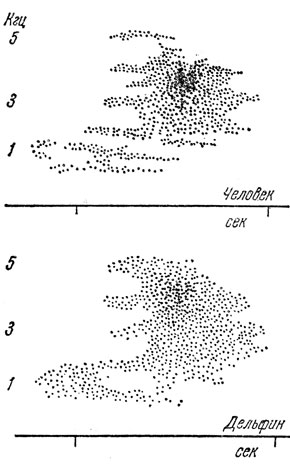 Среди многочисленных талантов, которыми природа так щедро наделила дельфинов, исключительно большой интерес для науки представляет сегодня их феноменальная способность к звукоподражанию. Подражательные (гоминидные) звуки в лексиконе "интеллигентов моря" впервые были открыты Джоном Лилли и Элис Миллер. Произошло это совершенно случайно. Однажды во время проведения серии опытов с дельфинами (когда с помощью специальных электродов определенные участки мозга раздражали слабыми электрическими сигналами) вышел из строя прибор, вызывавший у афалины ощущение удовольствия, но магнитофон, включавшийся обычно при выполнении экспериментов, продолжал работать, и на пленке оказались записанными все звуки, издаваемые дельфином во время опытов и после поломки прибора. Когда прослушали запись, выяснилось, что "речь" дельфина похожа на карикатурную копию слов, сказанных Лилли своей секретарше. Фонограммы убедительно показали действительное сходство между словом, сказанным человеком, и "словом", повторенным дельфином. Отчетливо слышны были также жужжание трансформатора, шум киносъемочной камеры, т. е. все те звуки, которые дельфину довелось слышать во время опытов. По-видимому, животное ассоциировало эти звуки с удовольствием, получаемым во время работы сломавшегося аппарата, и, подражая им, "заклинало" исследователей включить прибор. Вначале экспериментаторы приняли все это за типичный случай игры звуками и словами, как, например, у попугаев. Но затем было установлено, что если дрессировщик ежедневно громко разговаривает вблизи подопытного дельфина, то издаваемые последним звуки постепенно приобретают сходство с человеческой речью. Это подтвердили запись звуков на магнитофонной ленте и сравнение фонограмм голосов дельфина и человека. Человек произносил слова на частотах 400 — 3000 гц, а дельфин воспроизводил их на частотах 1000 — 8000 гц. Если магнитофонную ленту с "голосом" дельфина, имитировавшим голос человека, прослушивали при скорости, в 2 — 4 раза меньшей скорости записи, то достигали поразительного сходства в звучании голосов дельфина и человека.