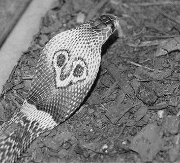 В угрожающей позе индийская кобра может поднимать верхнюю часть тела на 2/3 его длины. Ее капюшон – расширенная часть шеи – выражен намного ярче, чем у африканских кобр. На задней его стороне имеется очкообразный рисунок в виде двух белых колец и поперечной изогнутой полосы между ними. В связи с этим кобр данного вида иногда называют очковыми змеями. Назначение такого рисунка – пугать врагов, подходящих к змее с тыла. Нижняя часть шеи окрашена в белый цвет и имеет три черных пятна. В боевой стойке кобра внимательно контролирует лишь узкое пространство перед собой.