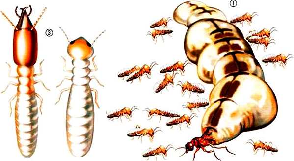 1. Матка (ее размер в сотни раз превышает размер простого термита) 3. Личинки термитов