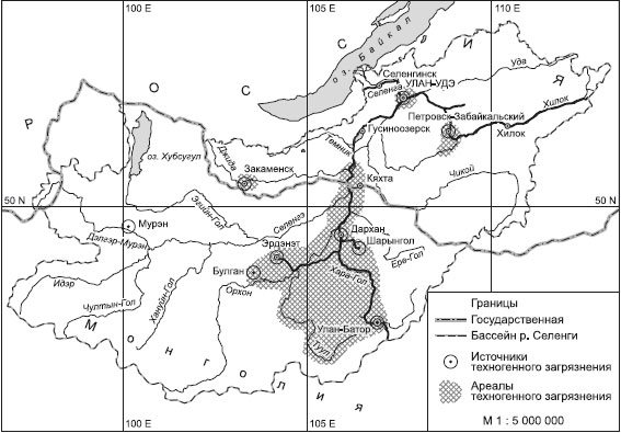 В своем верхнем течении р. Селенга пересекает Центральный регион Монголии, в котором сосредоточены мощные источники техногенного загрязнения, связанные с предприятиями по добыче руд цветных, редких и благородных металлов, бурого угля и других полезных ископаемых в городах Булган, Дархан, Мурен, Улан-Батор, Шарын-Гол и Эрдэнэт (рис. 8.1). Кроме того, здесь расположены наиболее крупные предприятия топливно-энергетической, легкой и пищевой промышленности. В целом в монгольской части бассейна Селенги, занимающей всего 20 % территории Монголии, проживает 65 % населения, производится 80 % промышленной и более 60 % сельскохозяйственной продукции.