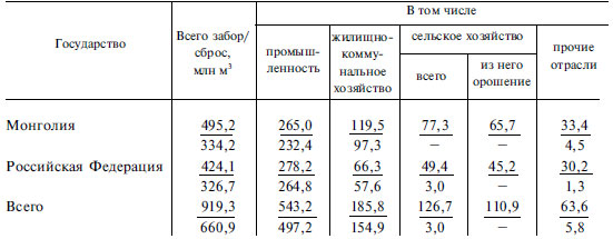 Общий объем водозабора в монгольской части бассейна Селенги в 2004 г. составил 495,2 млн м3 и увеличился по сравнению с 1990 г. в 1,5 раза, прежде всего за счет роста промышленного водопотребления (почти в 2,5 раза). В структуре промышленного водопотребления более 50 % забранных вод приходилось на горно-добывающую промышленность. Уровень экономии воды в промышленности за счет оборотного водоснабжения невысок и составляет менее 40 % [Статистический бюллетень…, 2006]. В сельском хозяйстве практически весь объем забранной воды приходится на орошение, на нужды которого расходуется более 70 млн м3. Следует отметить, что здесь расположено более 90 % орошаемых угодий Монголии.