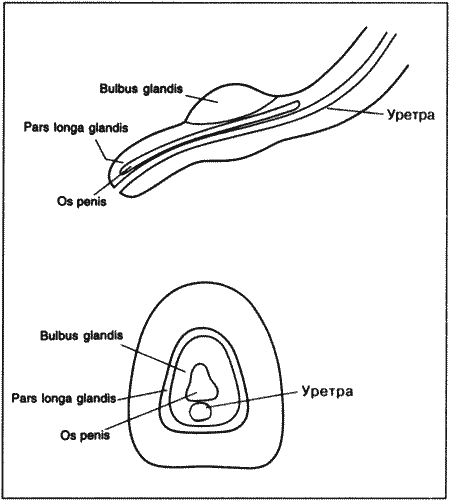 В половом члене у кобелей и котов имеется кость полового члена (os penis). Ее наличие позволяет самцу совершить интромиссию до достижения полной эрекции. У кобелей os penis имеет желоб, внутри которого проходит уретра (фиг. 6.1).