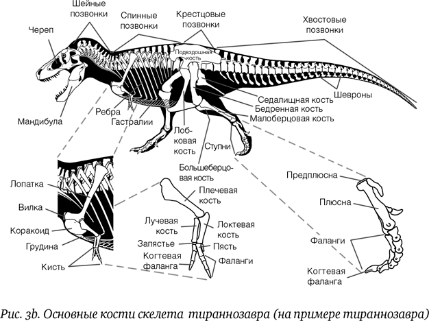 На рисунке представлен упрощенный вид скелета. Всего в одной особи тираннозавра содержится пара сотен костей (и у большинства еще добрая сотня зубов в челюстях), большая часть которых парные (левая и правая плечевые кости, левая и правая подвздошные, левая и правая верхнечелюстные и т. д.), кроме позвонков и вилки (хотя на самом деле она представляет собой сросшиеся парные кости – ключицы). В большинстве ископаемых экземпляров присутствует только лишь малая часть от этого общего количества, и даже в скелетах, характеризуемых как «полные», могут отсутствовать довольно много костей (конечно, если у вас осталась левая передняя лапа, вы имеете представление о том, как выглядела правая и т. д.).