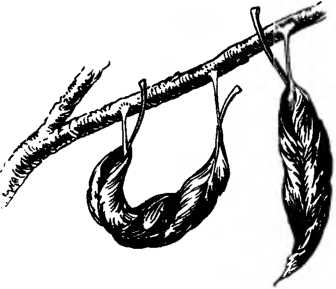 Подхваченная «пояском» из шелковинок, куколка боярышника хорошо заметна на ветке, на стволе. Бывает, что сколько-то гусениц перед окукливанием сползаются вместе, и тогда образуется целая кучка куколок. Такую кучку издали видно. И все же птицы не очень-то расклевывают эти куколки: их окраска предостерегающая: яркие черные и оранжевые пятнышки на светлом фоне.