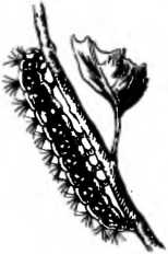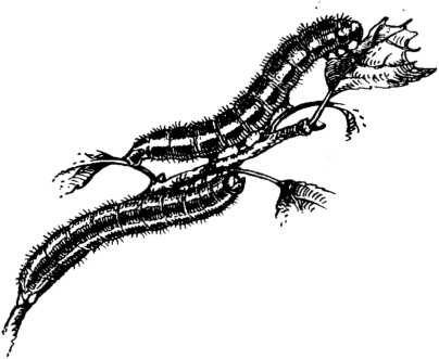 Не всякая птица станет клевать гусениц златогузки. Вдоль темной гусеницы тянутся два ряда белых пятен и два ряда красных бородавок. На бородавках — пучки волосков.