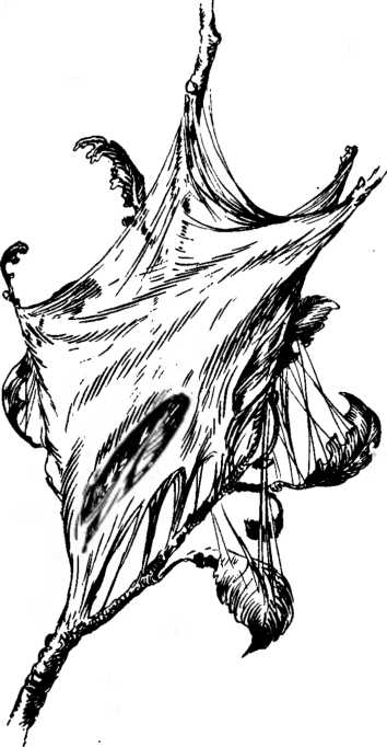 Иной раз на дереве увидишь не два-три качающихся на шелковой привязке листа. На конце ветки или в развилке тонких веточек — целый ком оплетенных паутиной листьев.