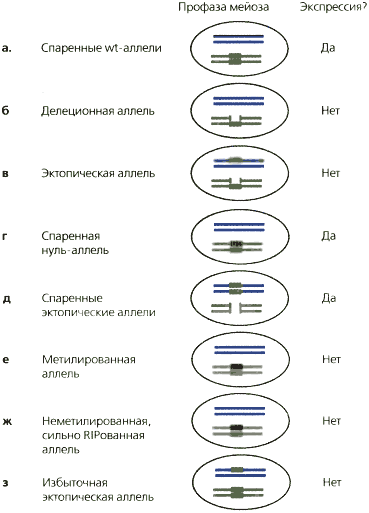Изображение тестов, проведенных в лабораториях Метценберга и Арамайо (Aramayo and Metzenberg, 1996; Shiuetal., 2001; Prattet al., 2004), описавших это явление Показаны только две из семи хромосомы Neurospora; их нуклеотидные последовательности изображены, соответственно, зеленым и синим цветом Прямоугольником показан ген, нормально функционирующий в мейозе. Вертикальными линиями показаны мутации, а метилирование ДНК показано красным цветом. Делеции изображены в виде пустых промежутков. Пояснения см. в тексте
