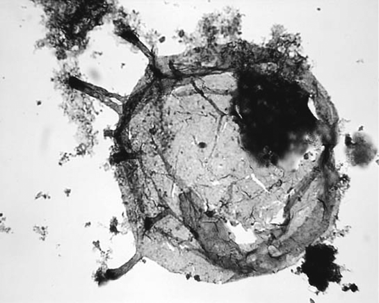 Рис. 28. Ископаемый акритарх (Tappania plana). Этот и другие ныне вымершие организмы были предшественниками современного эукариотического фитопланктона. Этот экземпляр был найден в Северной Австралии и датируется периодом 1,4–1,5 млрд лет тому назад. Он был довольно крупным: диаметр данной клетки составляет приблизительно 110 микрометров. (Публикуется с разрешения Эндрю Нолла.)