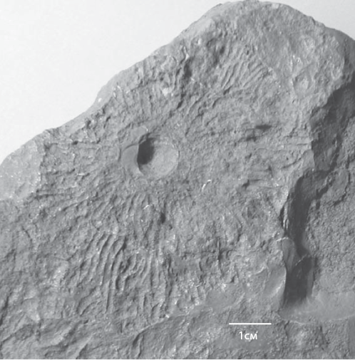 Рис. 29. Ископаемое Dickinsonia – вымершее животное, найденное в Эдиакарских холмах в Южной Австралии. Этот и другие представители эдиакарской фауны являются древнейшими ископаемыми животными; они появились около 600 млн лет назад в океанах. (Публикуется с разрешения Джири Липпса.)
