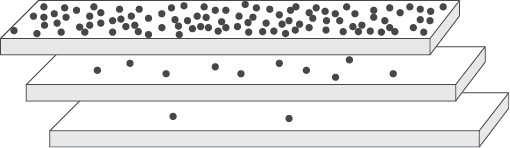 Рис. 30. Проблема диффузии кислорода в многоклеточном организме. Без какой-либо системы циркуляции кислород мог поступать в клетки только посредством диффузии. Если животное живет на морском дне, единственным источником кислорода является вышележащая водная толща. Кислород, достигающий первого слоя клеток, уходит на нужды респирации, и второй слой получает гораздо меньше кислорода, чем первый, и так далее. Почти не вызывает сомнений тот факт, что именно диффузия кислорода послужила одной из причин эволюционного отбора плоских организмов в начале эдиакария