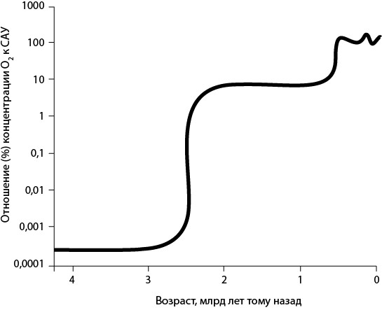 Рис. 31. Современная реконструкция содержания атмосферного кислорода на протяжении геологического времени. Обратите внимание на то, что для концентрации кислорода используется логарифмическая шкала. Концентрация кислорода на протяжении первой половины земной истории была исчезающе мала, порядка 0,0001 % современного атмосферного уровня (САУ). Во время Кислородной катастрофы (2,4 млрд лет тому назад) концентрация, вероятно, повысилась до приблизительно 1 % современного уровня и затем до примерно 10 % в эдиакарский и кембрийский периоды (600–500 млн лет тому назад). На протяжении последних 500 млн лет содержание кислорода оставалось относительно высоким и относительно стабильным, варьируя между приблизительно 50 и 150 % современного значения