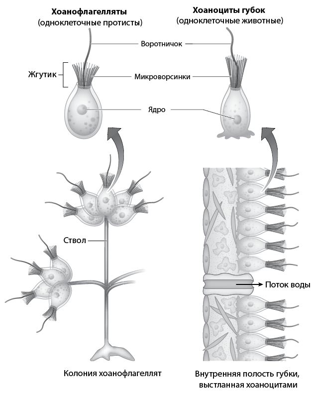 В 1841 году, за девятнадцать лет до выхода в свет «Происхождения видов», французский биолог Феликс Дюжарден заметил некоторое сходство между хоанофлагеллятами и морфологией клеток, выстилающих внутренние полости губок. Он назвал эти клетки хоаноцитами. Хоаноциты губок двигают своими жгутиками в едином ритме, перекачивая через внутреннюю полость губки десятки литров воды в день. Во внутренней полости губок хоаноциты отфильтровывают из проходящей воды бактерии и органические частицы, используя свои жгутики для захвата и поглощения строительного материала для колонии. Движение жгутиков синхронизировано, чтобы создавать единонаправленный поток воды через тело животного, точно так же, как гребцы на триремах синхронизировали свои гребки, чтобы судно могло двигаться по воде. Это может показаться удивительным, но у губок нет нервной системы. Остается неясным, каким образом отдельные хоаноциты сообщаются друг с другом и какие сигналы отвечают за координацию движений миллионов жгутиков. В любом случае синхронизированное движение миллионов жгутиков способствует перемещению больших объемов воды – и в результате эта макроскопическая колония клеток более не действует так, как если бы пребывала в жидкости, вязкой как патока.